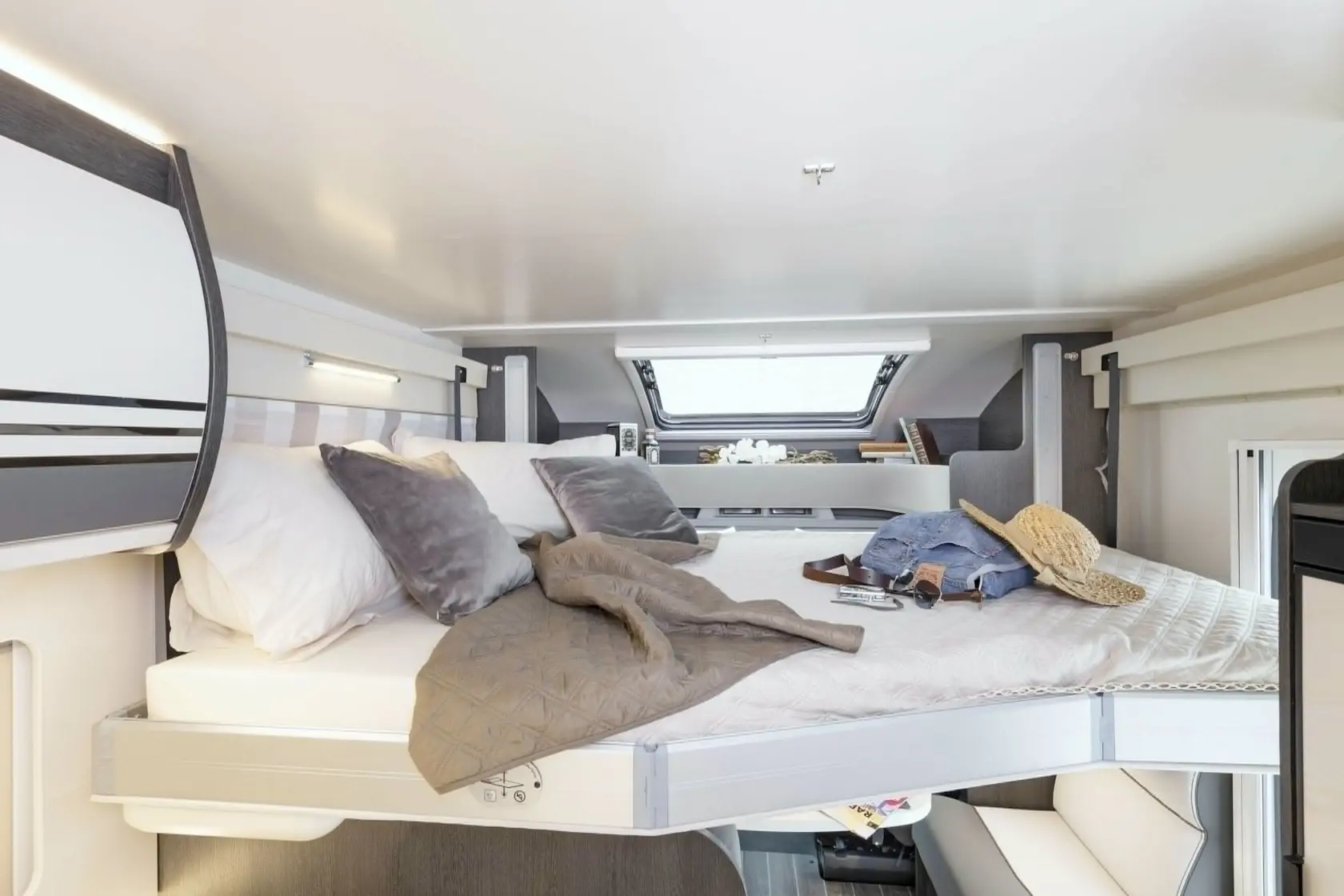 - 3 łóżka: na tyle auta 2 pojedyncze łóżka łączone w jedno ogromne do spania na 3 osoby, w salonie opuszczane elektrycznie spod sufitu na 2 osoby,